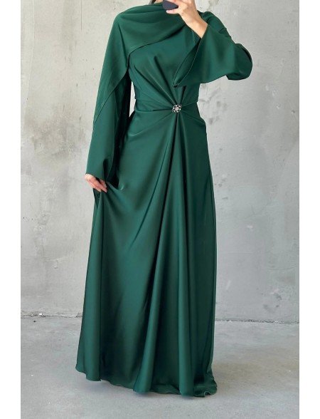 Questo abito combina la leggerezza e la lucentezza del raso con un design sofisticato. Il tessuto fluido scivola delicatamente sul corpo, mentre il drappeggio in vita valorizza la silhouette con eleganza. La fibbia impreziosita da dettagli in pietra aggiunge un tocco di raffinatezza e glamour.