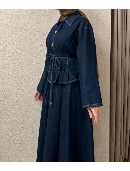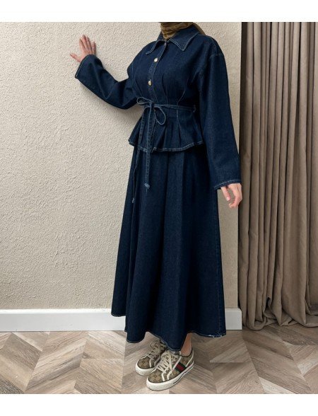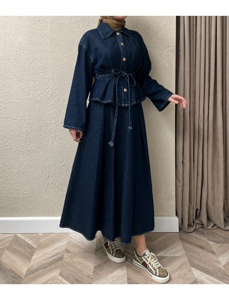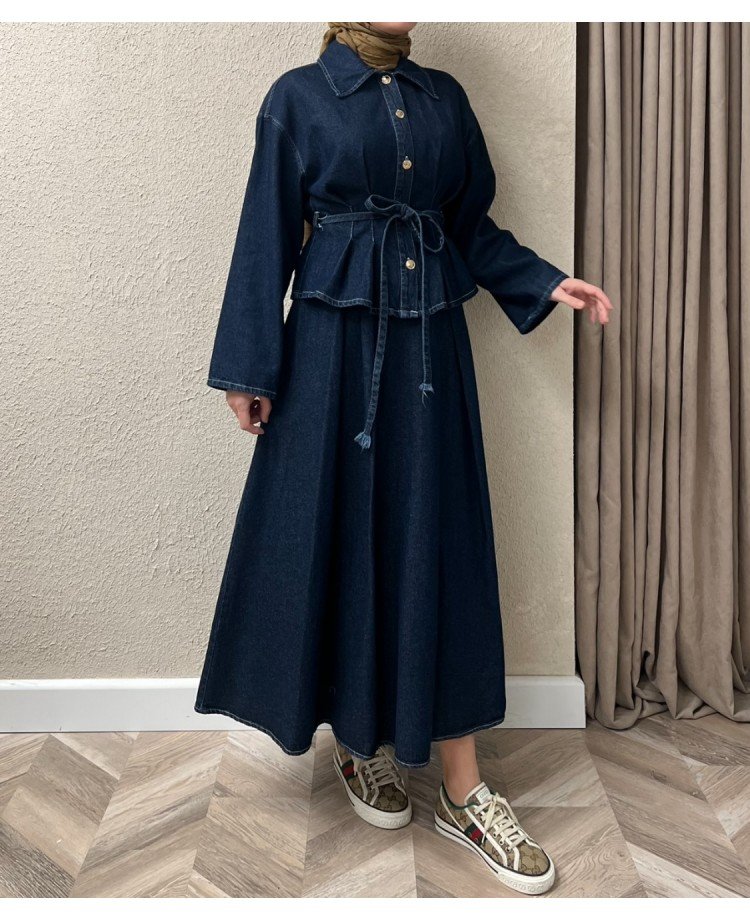 Il nostro set in denim blu navy è perfetto per uno stile casual-chic, composto da una camicia con bottoni e una gonna coordinata. La camicia presenta bottoni frontali e una cintura regolabile, per valorizzare la silhouette, mentre la gonna completa il look con una linea elegante e versatile. Realizzato con materiali di alta qualità, è ideale da indossare insieme o da mixare con altri capi.