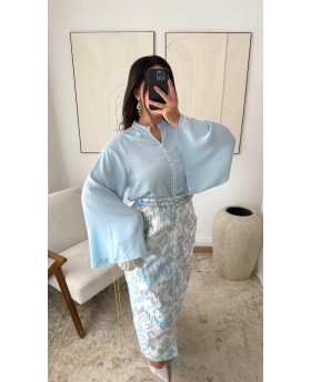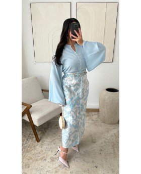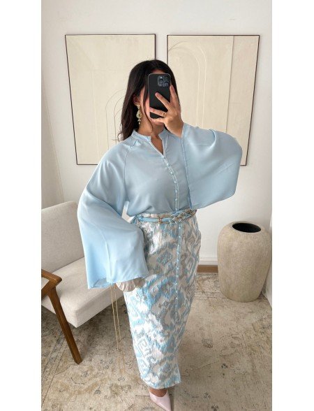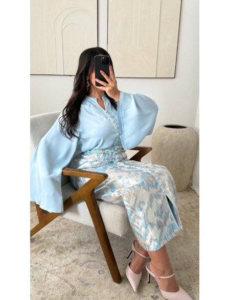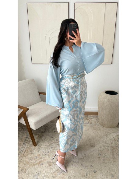 Il top con scollo a V e la gonna fluida sono realizzati in un elegante broccato dorato e completati da una cintura intrecciata che valorizza il punto vita con delicatezza.