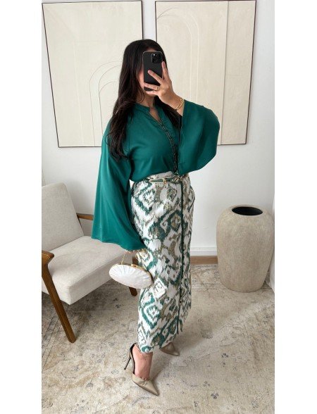 Il top con scollo a V e la gonna fluida sono realizzati in un elegante broccato dorato e completati da una cintura intrecciata che valorizza il punto vita con delicatezza.