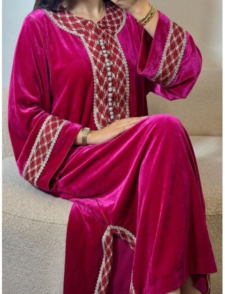 Tessuto: Realizzato in un velluto di seta royale, noto per la sua lucentezza cangiante e la sua caduta fluida e pesante, che conferisce un aspetto maestoso.
