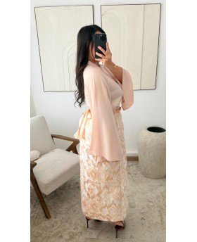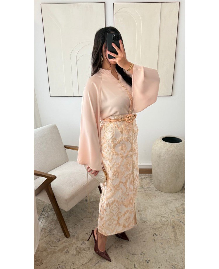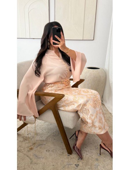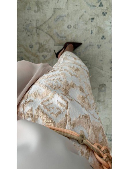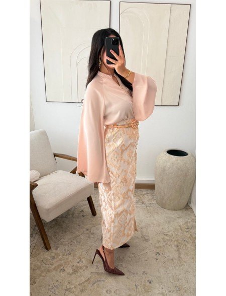 Il top con scollo a V e la gonna fluida sono realizzati in un elegante broccato dorato e completati da una cintura intrecciata che valorizza il punto vita con delicatezza.